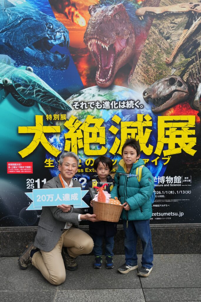 記念セレモニーでは、ダンクルオステウスを楽しみに来られたというご家族に本展図録やぬいぐるみをプレゼントしました。